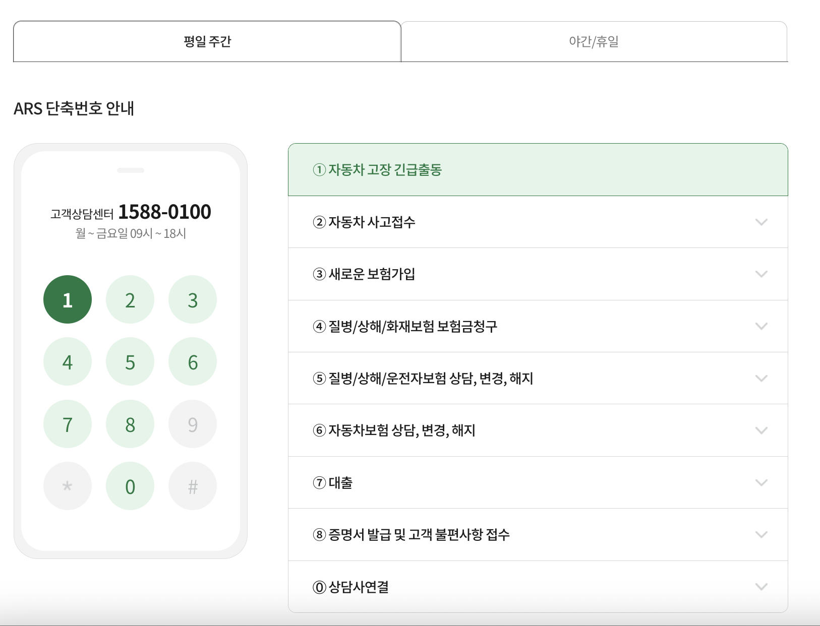 참고로, 평일 주간 그리고 야간/휴일 동부화재 다이렉트 자동차보험 긴급출동 콜센터 ARS 단축번호에 대한 보다 상세한 내용은 아래에서 다시 한번 더 확인하세요.