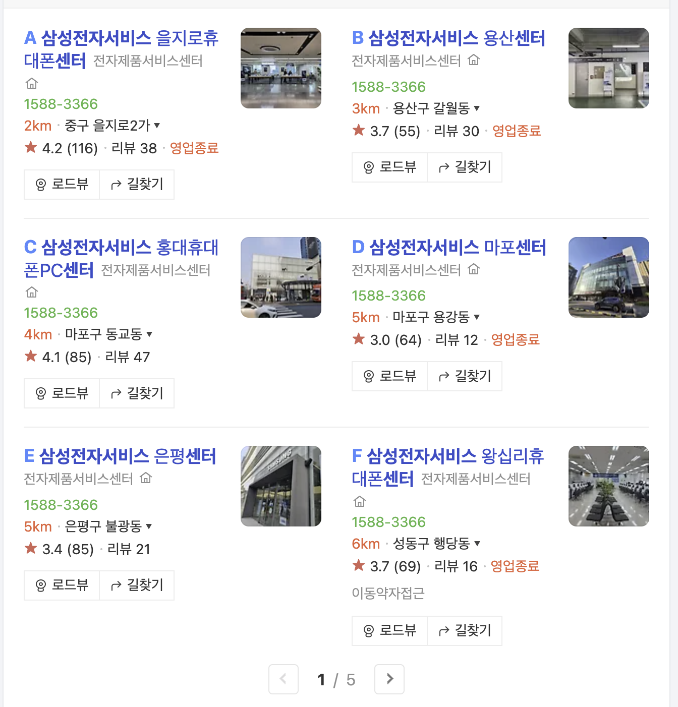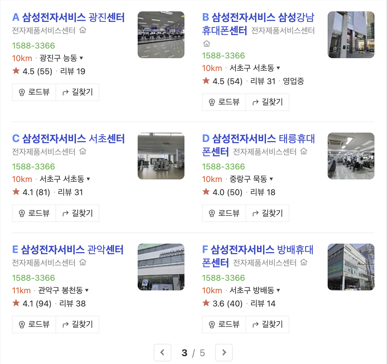 다음이나 네이버에서 "삼성전자 서비스센터"로 검색을 하셔도 아래와 같이 지역별로 센터를 확인할 수 있습니다. 지도 앱이 이럴 때는 어쩌면 더 좋을 수도 있습니다. 요즘은 지도 앱이 좋아서 로드뷰, 즐겨찾기도 가능합니다. 또한, 내비게이션 역할도 하기 때문에 출발지, 도착지로 삼성전자 AS센터를 설정해 두면 바로 길찾기 까지 가능한 것이죠.
