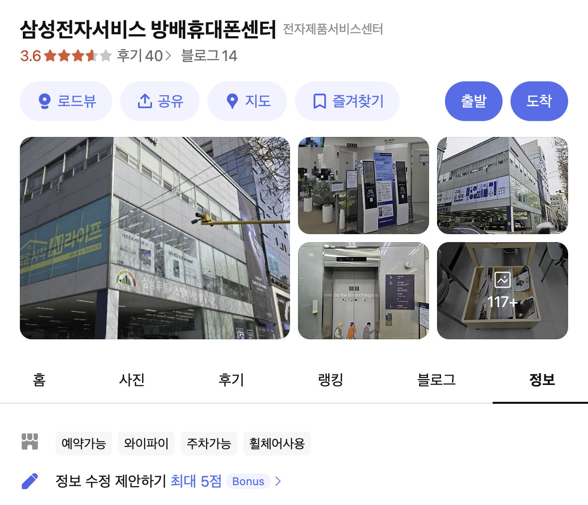 - 운영시간, 점심시간, 수리 가능 제품, 주차정보 등 상세 확인 가능