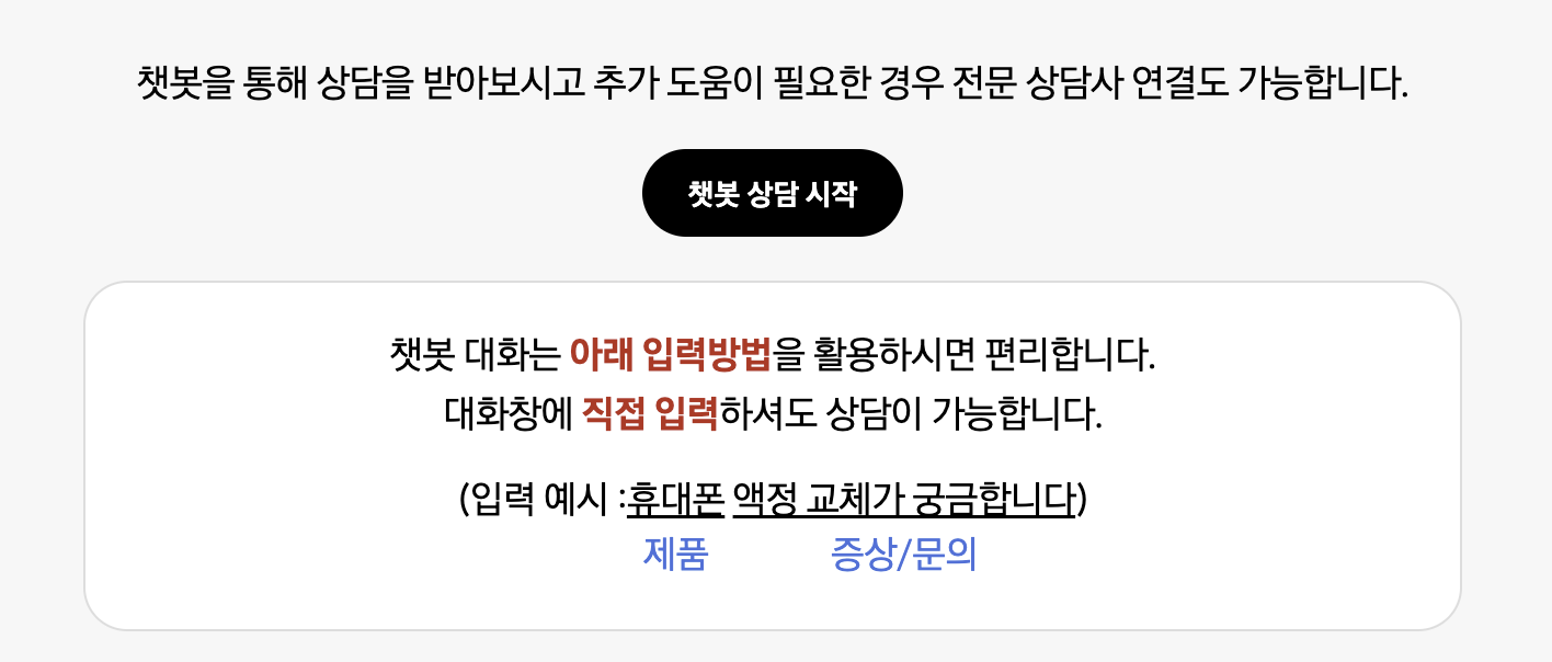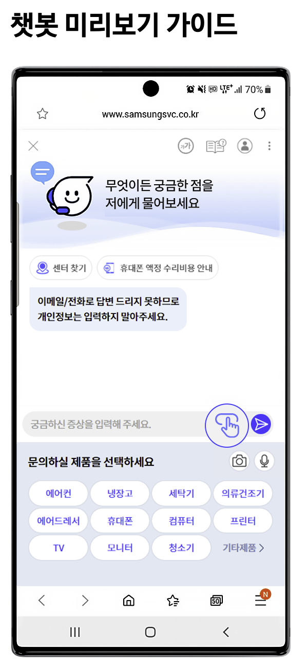 삼성전자서비스에서는 신속한 상담 및 고객 편의를 위해서 AI 상담 봇도 있습니다.