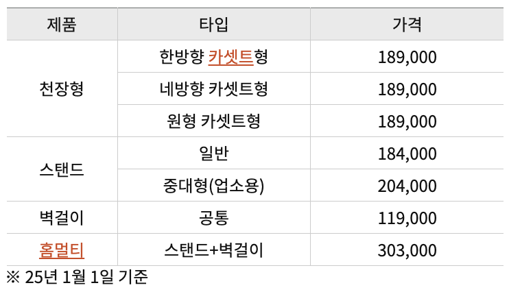 ※ 2025년 1월 1일 기준 가격표입니다.