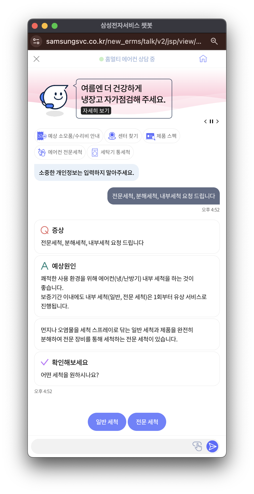 위와 같이 챗봇 상담을 누르게 되면 팝업창이 하나 더 열립니다. 여기서 "일반 세척", "전문 세척"을 선택하셔서 진행하시면 됩니다.