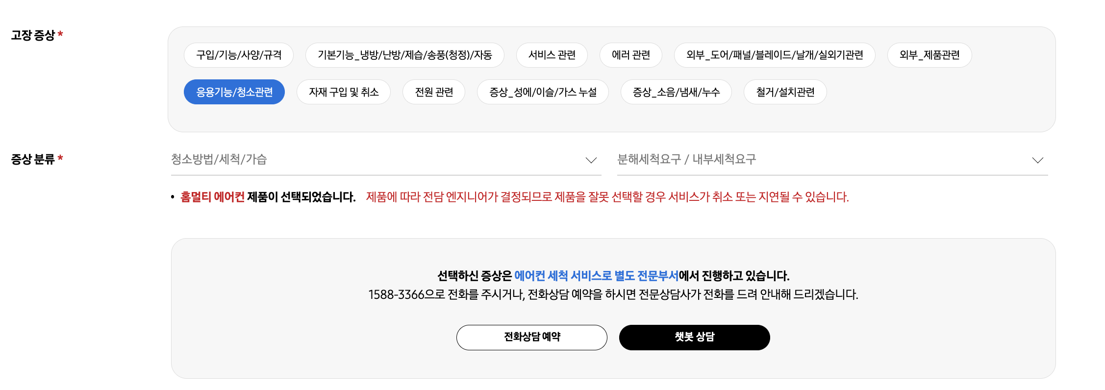 삼성 에어컨 청소 예약을 하기 위해서는 고장증상에서 선택하시면 됩니다.