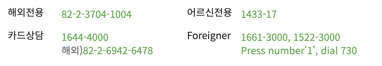 | 카드 고객센터 | 1644-4000 | 해외: +82-2-6942-6478 |